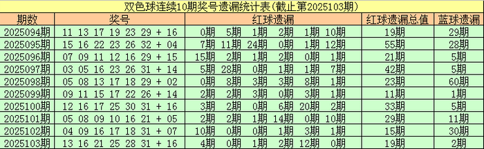 安队第2025104期双色球遗漏分析:(热码:遗漏0-3期,温码遗漏4-9期,冷码遗漏10期及以上)